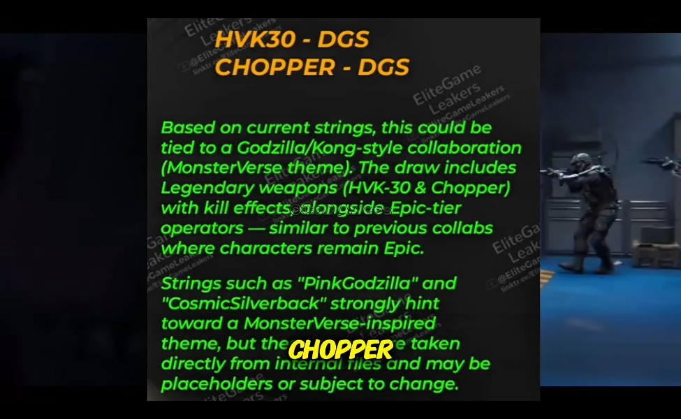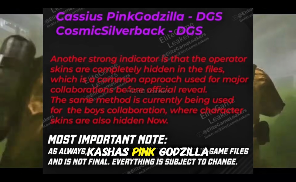 • Leaked skins include 'Pink Godzilla' for operator Cassius and 'Cosmic Silverback' representing King Kong, with potential for tactical soldier themes.