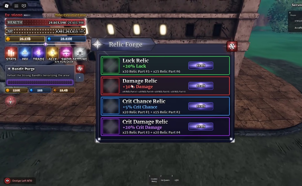 | Crit Damage Relic | +20% Crit Damage | 25x Relic Part #3, 20x Relic Part #4 |