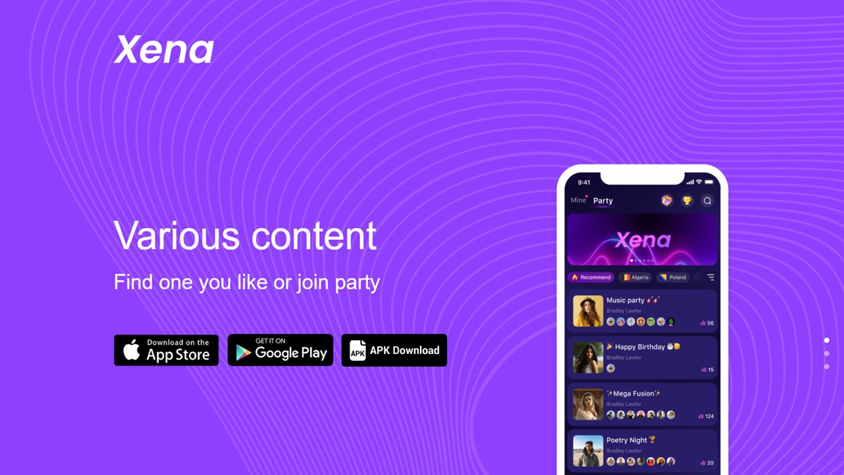 - Xena Live Group Voice Chat is a social platform focused on real-time voice chat rooms, allowing users to communicate without typing.