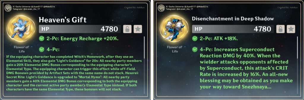 - Heaven’s Gift: The 2-piece gives +20% Energy Recharge. The 4-piece is a support dream: using an Elemental Skill gives your team a 20% Elemental DMG Bonus matching the wielder’s element. In Hexerei comps, this upgrades to Mortal Hymn, granting a 40% DMG bonus based on both the wielder’s and the active character’s elements.