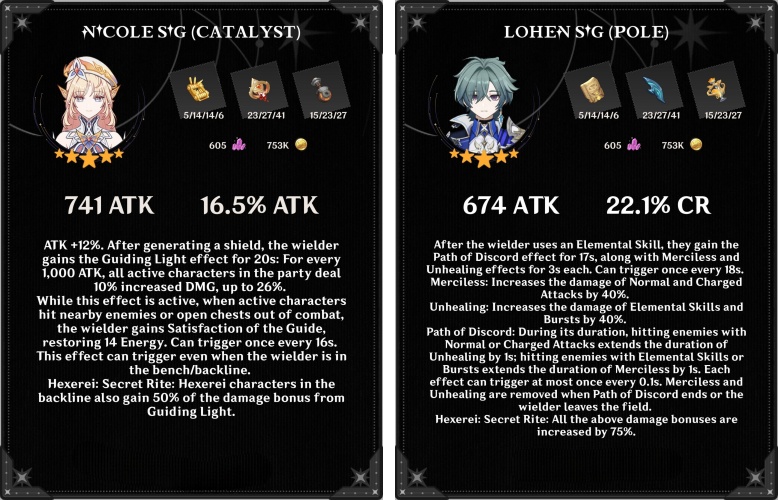 - Dustlight Septenary (Catalyst): This is Nicole’s signature weapon. Boasting a massive 741 Base ATK, it grants the Guiding Light effect whenever the wielder generates a shield. This boosts the active character’s DMG by up to 26% based on the wielder’s ATK. If you run a Hexerei team, off-field members get half of that buff too!
