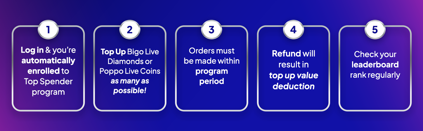 The Top Spender Program is a special promotion designed to reward customers who make the largest BIGO Live Diamonds or Poppo Live Coins purchases between March 10 – April 12, 2026.
